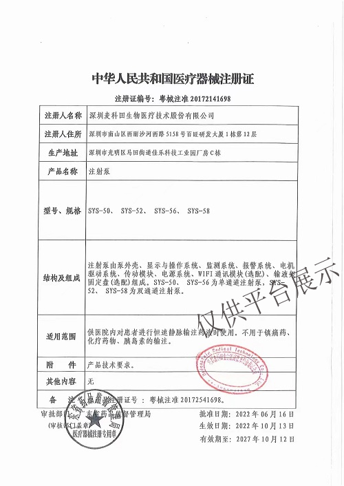 11、報警:注射將完成(殘留量)、注射器推空、注射完成、注射阻塞、電池電量低、電池電量嚴(yán)重短缺、無電池、無外部電源、注射器無法識別、推頭安裝不正確、注射泵自檢和運行過程故障自動診斷報警、遺忘操作。